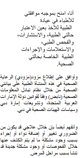 I hereby giving my consent to the physicians of this Clinic for my Medical History taking, Consultation, Physical Examination, Medical Investigation & Procedures regarding my health. I agree that healthcare provider(s) involved in my care at this facility will access my health information through the Health Information Exchange System (NABIDH) in accordance with the Laws of the United Arab Emirates, Emirate of Dubai Legislation and Dubai Health Authority Policies. I also understand that during my treatment it may be necessary to change or add medicine or procedure because of condition found that were not discovered during examinations or new condition may arise according to disease process. |